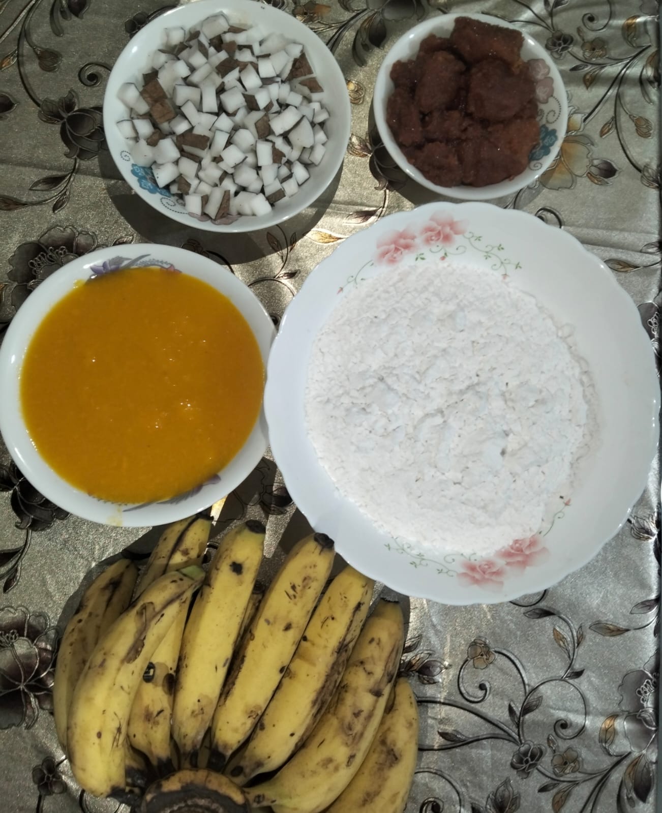 ২. চালের গুঁড়া, গুড়/চিনি, নারকেল কুচি, লবণ মিশিয়ে ঘন ব্যাটার তৈরি করুন।